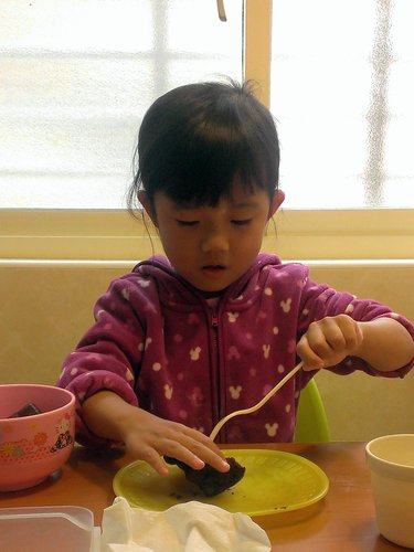 早上拔拔值班,歐寶吃完蛋糕後就陪媽媽我一起做牛奶麵包棒