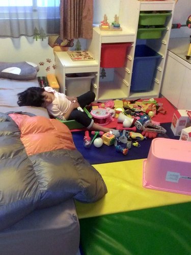 歐寶…竟然是這付模樣~坐在一旁都是玩具的玩具收納箱裡睡著了,而拔拔早