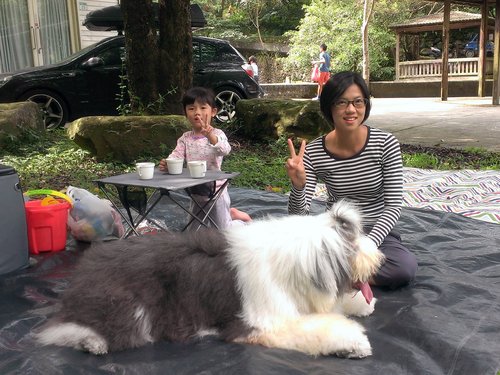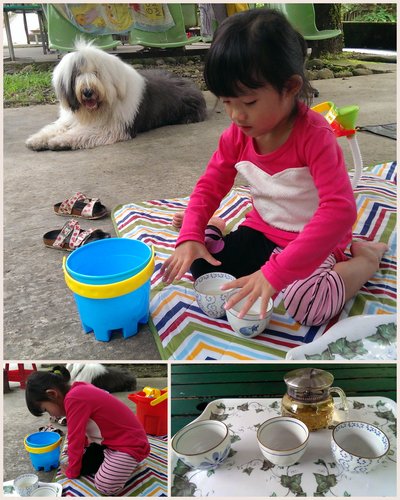Olay很聰明,拔拔一鋪好野餐墊馬上坐上休息。歐寶則拿出茶杯在喝飲料、