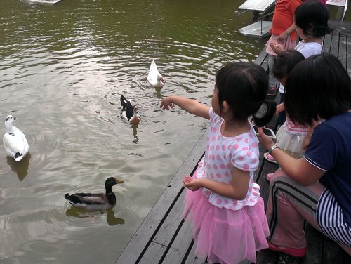 小朋友在餵鴨子、烏龜吃飼料~不過這個平台沒有欄杆,很怕小朋友不小心會