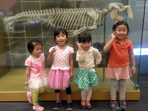 小朋友在恐龍化石前做鬼臉!後來雨實在太大了,我們只好先回家,回到家四