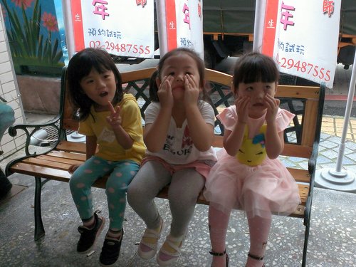 上課前這三位小孩坐在外面椅子上做鬼臉
