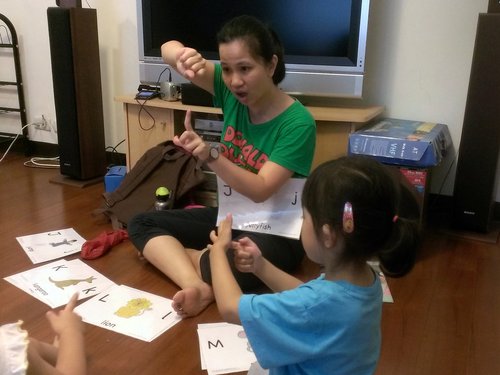 這星期英文課老師依舊先幫小朋友複習字母G-M,不過歐寶還是對圖卡上的單