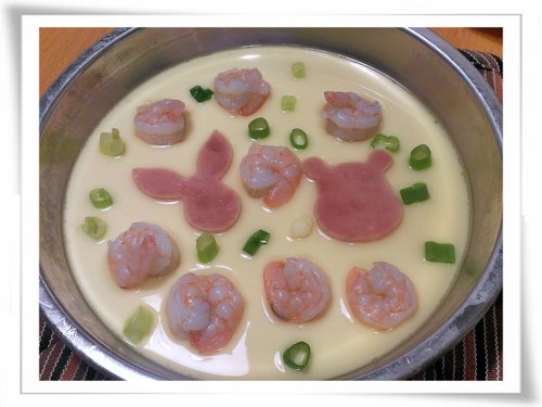 4.在蒸蛋上加上蝦仁、火腿、蔥花再蓋上保鮮膜,外鍋加1/3杯水至開關跳起即可