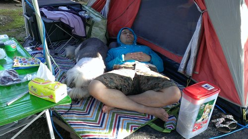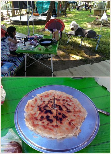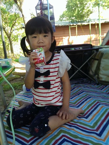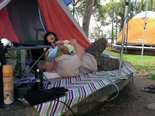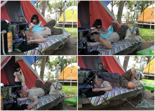7點多歐寶還沒醒,拔拔跟Olay在帳棚門口前繼續睡回籠覺!