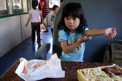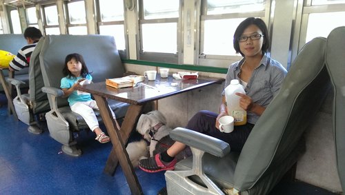 我們在有冷氣的車廂內用餐,我手上拿的是我們電冰箱裡的果汁,這電冰箱