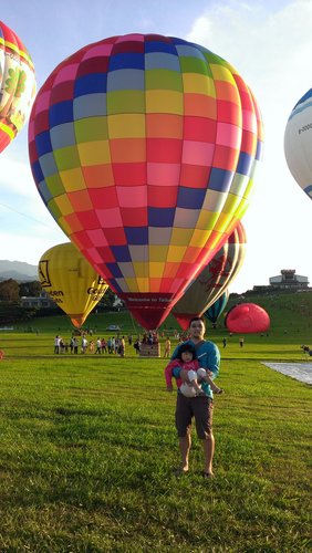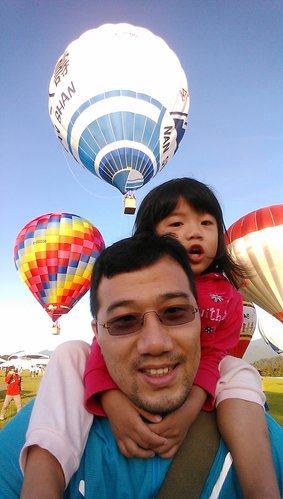 拔拔抱著還想睡的歐寶一起跟後方熱氣球拍照