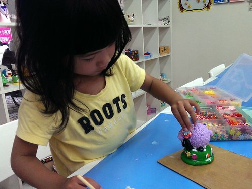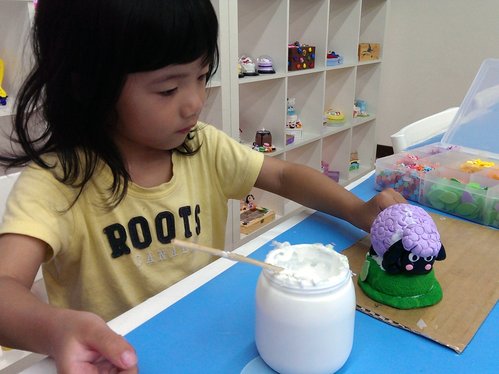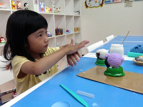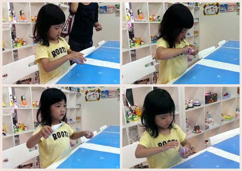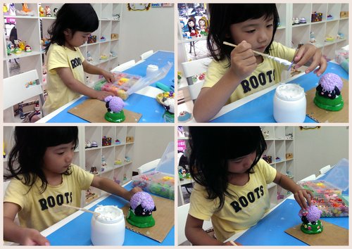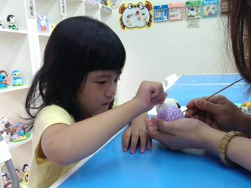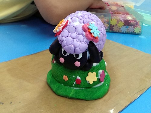 歐寶這次要做羊咩咩,而且還是紫色的喔!照片中的歐寶正在努力將白色跟