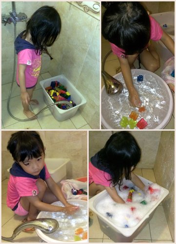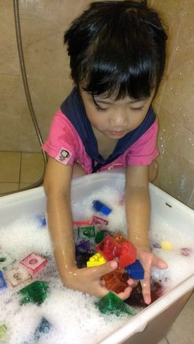 歐寶突然說要幫他的積木洗澡,於是自己將裝積木的箱子搬到浴室放水幫積