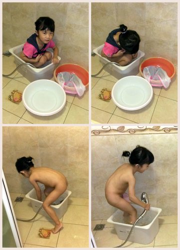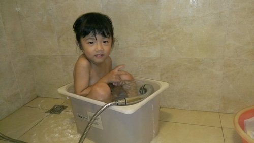 洗著洗著,自己也脫起衣服泡在箱子裡啦!