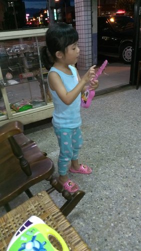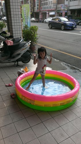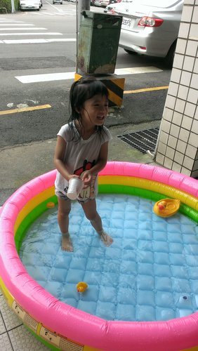 下午很無聊,於是拿出小游泳池在騎樓玩水