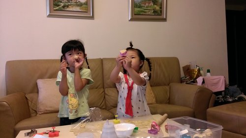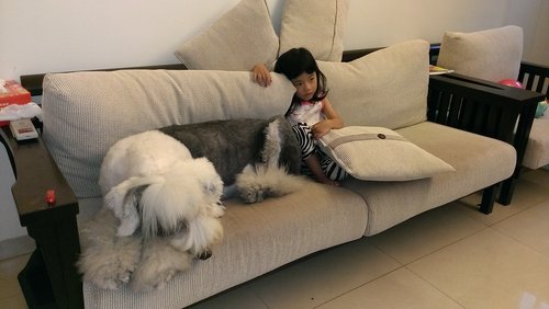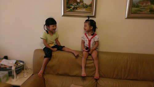 Olay在沙發上坐著,歐寶也爬上去跟Olay一起坐。晚上跟拔拔一起做憤怒鳥~