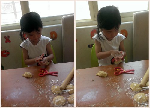 款麵糰很濕,不容易整型,但歐寶玩麵糰玩得很快樂!