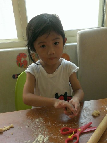 歐寶很認真的在戳揉麵糰,還拿出他的剪刀要剪圖案