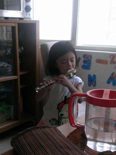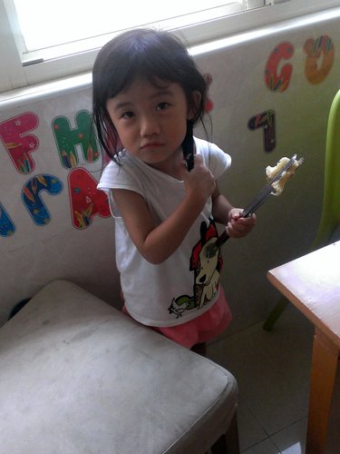 餐包剛出爐會燙,歐寶用夾子挾來吃~挺聰明的!