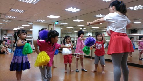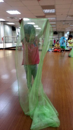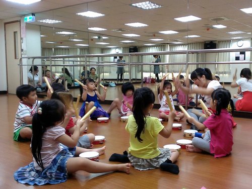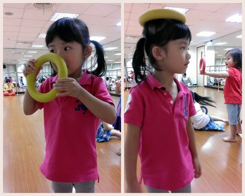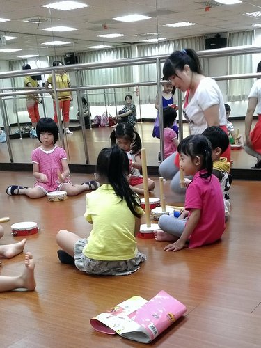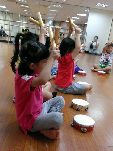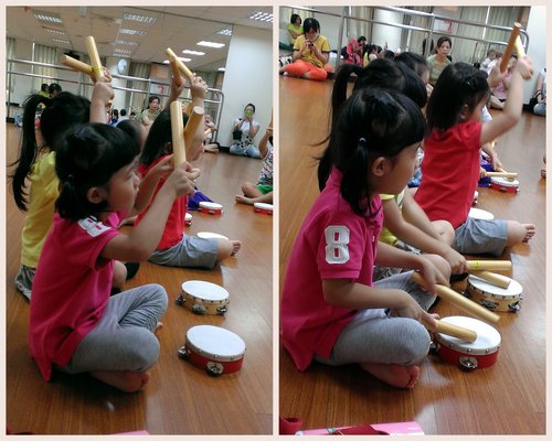 歐寶很喜歡這堂打擊音樂律動課,可以拿著樂器玩又可以跟著音樂動來動去