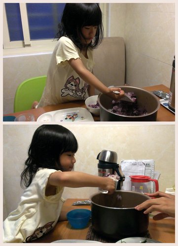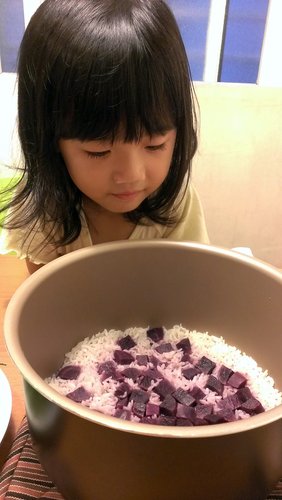 我的意料外,他自己添飯,還主動挖地瓜來吃,他說紫色的地瓜好吃!!