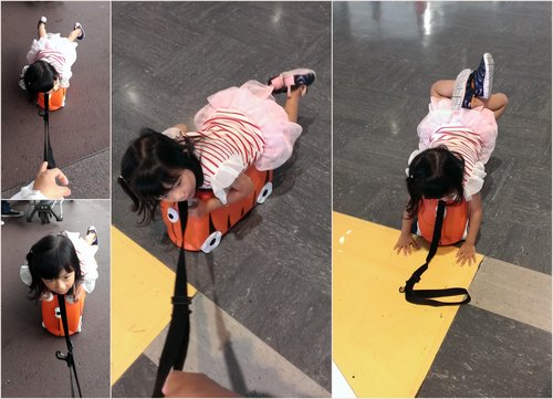 買的行李箱,媽媽我邊拉著行李箱,歐寶就在行李箱上表演特技!