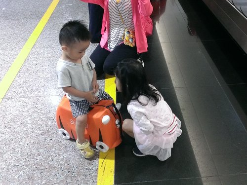 來坐?」弟弟回:「好!」然後坐在他的行李箱上